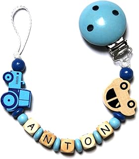 Baby Schnullerkette mit Perlen aus Holz und Wunschname Traktor und Stern Lukas