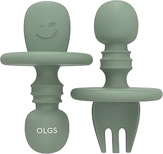 Silikon Kinderbesteck 2er Set Grün | Das erste Babybesteck Gabel und Löffel BPA-frei, einfach zu reinigen | Beißring zum Zahnen Beißspielzeug für Babys und Kinder | Selbstfütterndes Besteck (Sage)