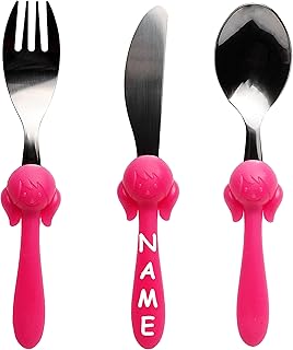 3 TLG. Set _ Besteckset - aus rostfreien Edelstahl - lustige Figuren - PINK / ROSA - inkl. Name - Kinderbesteck - rostfrei _ Gabel + Löffel + Messer - abg..